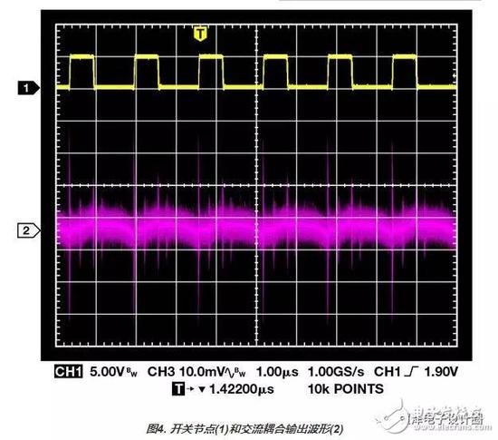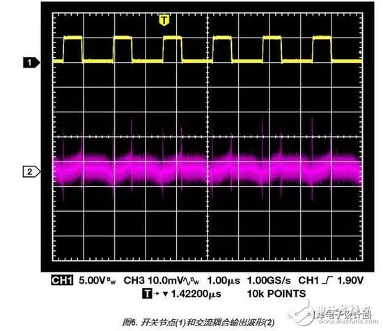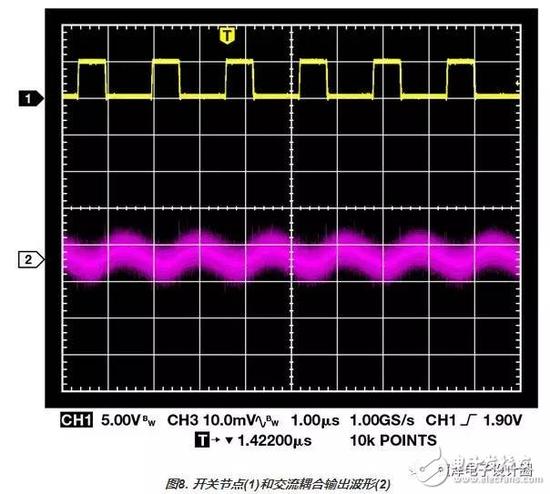 图8. 开关节点(1)和交流耦合输出波形(2) 最佳方法
