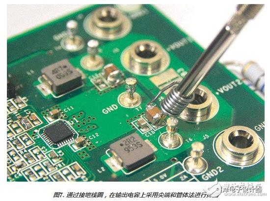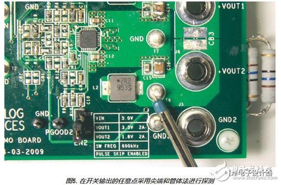 有几种方法可以减小杂散电感。一种方法是移除标准示波器探针的长接地引线,并将其管体连接至接地基准点。图5显示尖端和管体方法。然而,在本例中,尖端连接错误的调节器输出点,而非直接连接输出电容;正确方法应当是直接与输出电容相连。接地引线已移除,但PCB上走线引起的电感仍然存在。图6显示采用500MHz带宽设置时的波形结果。因为移除了长接地引线,所以高频噪声有所降低。