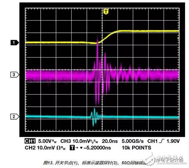 开关瞬变的能量较低,但是频率成分比输出纹波高。这种情况会在开关转换过程中发生,通常标准化为包含纹波的峰峰值。图13显示使用带有长接地引线的标准示波器探针与使用50Ω同轴端接电缆(500 MHz带宽)的开关瞬变测量结果对比。通常,由长接地引线造成的接地环路会产生比预期更高的开关瞬变。