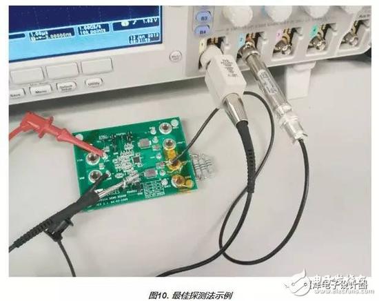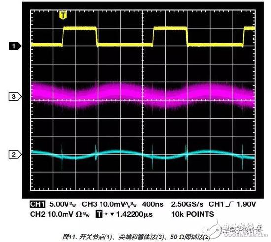 探测开关输出的最佳方法是使用50Ω同轴电缆,该电缆维持在50Ω环境下,并通过可选50Ω示波器输入阻抗端接。在调节器输出电容和示波器输入之间放置一个电容,可阻止直流电流通过。电缆的另一端可通过非常短的飞线直接焊接到输出电容上,如图9和图10所示。这样可以在宽带宽范围内测量极低电平信号时保持信号完整性。图11显示500 MHz测量带宽下,用尖端和管体法与50Ω同轴法在输出电容端进行探测的对比。