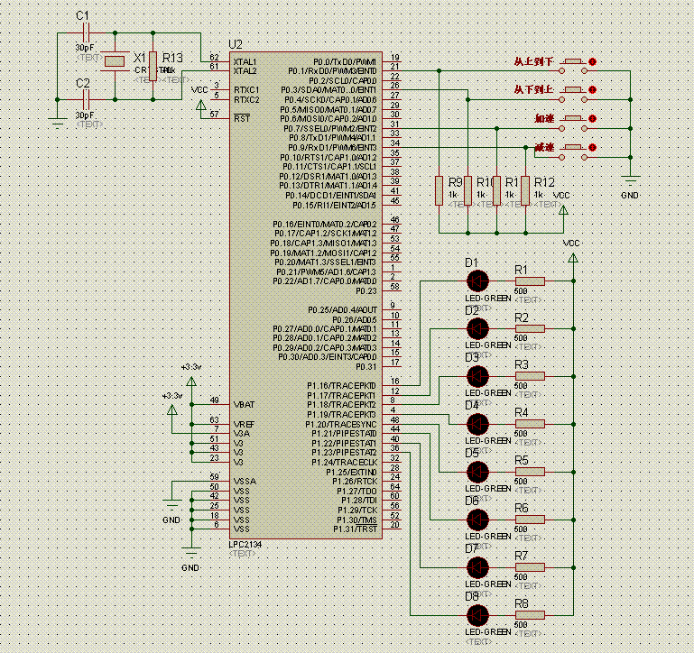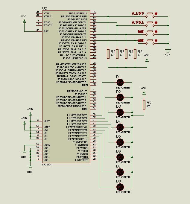 本次设计在上一篇(《基于ARM的流水灯仿真示例》)的基础上,加了晶振电路,并且改变和与LED灯相连的电阻的接法。在原来的设计中,所有的LED灯都和一个电阻相连,虽然仿真没有出现问题,但在现实电路中这样的接法很可能导致该电阻烧坏,所以本设计分别给每个LED灯接了一个电阻。整体电路的连接如下图所示。