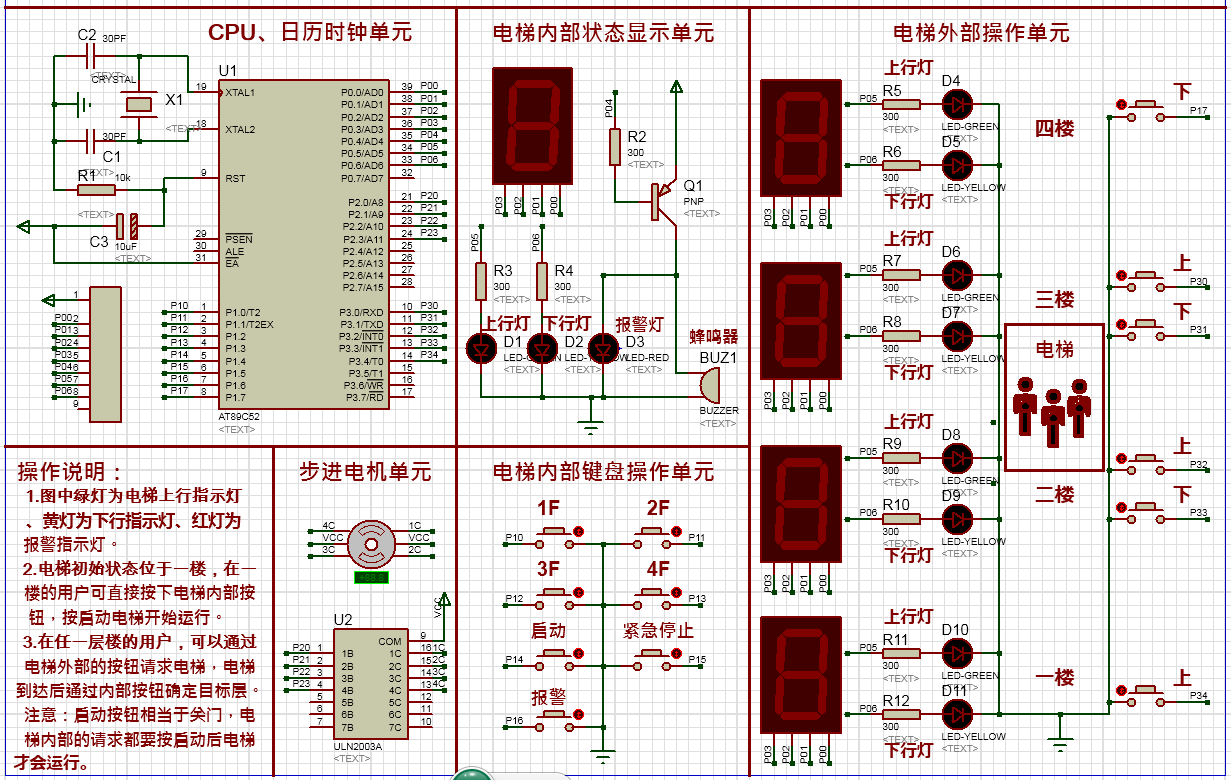 #include #include unsigned char ucMotorDrvPuls; //电机运转时初始值 unsigned char FORREV=1; //1表示上行,0表示下行 unsigned char STOPCUR=0;//1电梯停留在当前层,0不停留 unsigned char CURFLR=1; //当前所在楼层 unsigned char count=0; //累计到COUNT即表示运行过一层 #define UCTIMES 8 //设置电机转速 #define OUTPUT P2 //电机驱动信号口 #define COUNT 8 //电机每循环8次表示电梯经过一层楼 sbit UP1=P3^4; sbit DOWN2=P3^3; sbit UP2=P3^2; sbit DOWN3=P3^1; sbit UP3=P3^0; sbit DOWN4=P1^7; sbit FLOOR1=P1^0; sbit FLOOR2=P1^1; sbit FLOOR3=P1^2; sbit FLOOR4=P1^3; sbit START=P1^4; sbit STOP=P1^5; sbit ALARM=P1^6; //报警位 sbit alarmBit=P0^4; sbit upLight=P0^5; sbit downLight=P0^6; void time(unsigned int ucMs);//延时单位:ms void outPress();//按下电梯外按钮 unsigned char inPress();//按下电梯内楼层按钮 unsigned char elevator();//到达某一层返回1,否则返回0 void storeUP(unsigned char);//存储当前所有上行请求 void storeDOWN(unsigned char);//存储当前所有下行请求 //延时函数 void time(unsigned int ucMs); //初始化所有灯 void initLights(void); //设置当前楼层 void setFloor(int floor); //设置电梯向上运行灯 void setUpLight(); //设置电梯向下运行灯 void setDownLight(); //设置电梯停止运行灯 void setStopLight(); //设置电梯向上运行灯 void setAlarmLight(); //设置电梯报警灯和喇叭 void setAlarmLight(); //关闭电梯报警灯和喇叭 void offAlarmLight(); //报警开关 int alarmSwitch=1; unsigned char UP_req[5]={0,0,0,0,0}; //上行请求 unsigned char DOWN_req[5]={0,0,0,0,0}; //下行请求 //电机定位 void position(void) { OUTPUT=0x01|(P2&0xf0);time(200); OUTPUT=0x02|(P2&0xf0);time(200); OUTPUT=0x04|(P2&0xf0);time(200); OUTPUT=0x08|(P2&0xf0);time(200); ucMotorDrvPuls=0x11; OUTPUT=0x01|(P2&0xf0); } /****************************************/ /* 主函数 */ /****************************************/ void main(void) { time(100); initLights(); position();//电机定位 ucMotorDrvPuls=0x11; OUTPUT=0x00|(P2&0xf0);//电机停止 setFloor(CURFLR); setUpLight(); time(100); while(1)//主循环 { outPress();//按下电梯外按钮 while(STOPCUR==1)//电梯在当前层,电梯不动,可以继续接受请求 { outPress(); inPress(); } if(inPress())//按下电梯内楼层按钮 { while(START)//等待启动按键按下,电梯不动,可以继续接受请求 { outPress(); inPress(); } } while(1)//电机运转循环 { if(UP_req[1]==0&&UP_req[2]==0&&UP_req[3]==0&& DOWN_req[2]==0&&DOWN_req[3]==0&&DOWN_req[4]==0) { break;//没有请求,跳出电机运转循环,电梯不动 } if(FORREV)//上行 { setUpLight();//上行灯亮 if(STOPCUR==1){break;}// if(elevator())//往上到达某一层 { if(CURFLR==4) {setDownLight();break;}//到达四楼 } OUTPUT=(ucMotorDrvPuls&0x0f)|(P2&0xf0); ucMotorDrvPuls=_crol_(ucMotorDrvPuls,1); } if(!FORREV)//下行 { setDownLight();//下行灯亮 ; if(STOPCUR==1){break;} if(elevator())//往下到达某一层 { if(CURFLR==1) {setUpLight();break;}//到达一楼 } OUTPUT=(ucMotorDrvPuls&0x0f)|(P2&0xf0); ucMotorDrvPuls=_cror_(ucMotorDrvPuls,1); } outPress();//按下电梯外按钮 //if(inPress())//按下电梯内楼层按钮 //{ // while(START)//等待启动按键按下 //{ // outPress(); inPress();//电梯运行时,内部按钮按下,无需按启动按钮 // } //} time(380-UCTIMES*16); ////////// }//end while-电机运转循环 OUTPUT=0x00|(P2&0xf0);//电机停止,有请求时按下启动按钮启动 }//end while-主循环 } /****************************************/ /* 按钮事件 */ /****************************************/ //按下电梯外按钮 void outPress() { //FORREV=1; if(!UP1)//1楼上 { storeUP(1); if(CURFLR>1&&STOPCUR==1)//电梯不在一楼,且当前没其他请求,电梯马上自动启动 { FORREV=0;//向下运行 STOPCUR=0; } if(CURFLR==1) { STOPCUR=1;//电梯停留在当前层 } } if(!UP2)//2楼上 { storeUP(2); if(CURFLR>2&&STOPCUR==1)//电梯在二楼以上 { FORREV=0; STOPCUR=0; } if(CURFLR<2&&STOPCUR==1) { FORREV=1; STOPCUR=0; } if(CURFLR==2) { STOPCUR=1; } } if(!UP3)//3楼上 { storeUP(3); if(CURFLR>3&&STOPCUR==1)//电梯在三楼以上 { FORREV=0; STOPCUR=0; } if(CURFLR<3&&STOPCUR==1) { FORREV=1; STOPCUR=0; } if(CURFLR==3) { STOPCUR=1; } } if(!DOWN2)//2楼下 { storeDOWN(2); if(CURFLR>2&&STOPCUR==1)//电梯在二楼以上 { FORREV=0; STOPCUR=0; } if(CURFLR<2&&STOPCUR==1) { FORREV=1; STOPCUR=0; } if(CURFLR==2) { STOPCUR=1; } } if(!DOWN3)//3楼下 { storeDOWN(3); if(CURFLR>3&&STOPCUR==1)//电梯在三楼以上 { FORREV=0; STOPCUR=0; } if(CURFLR<3&&STOPCUR==1) { FORREV=1; STOPCUR=0; } if(CURFLR==3) { STOPCUR=1; } } if(!DOWN4)//4楼下 { storeDOWN(4); if(CURFLR<4&&STOPCUR==1) { FORREV=1; STOPCUR=0;
