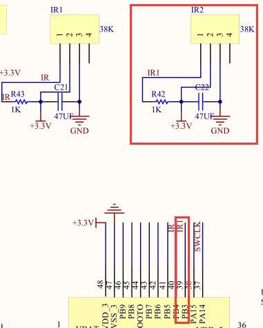 如上图,红外接收引脚接到PB3,PB3为JTAG使用引脚,因此在代码中要注意将引脚功能切换回普通IO口。