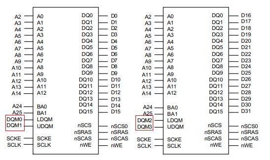 SDRAM以两片32M的K4S561632构成64M的RAM存储为例进行说明。