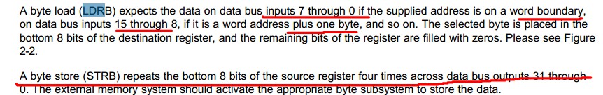 STRB指令首先数据总线(整个字的四个字节)都填充上要写入的一个字节的数据。然后,外部存储系统激活合适的字节存储子系统去存储这一个字节的数据。