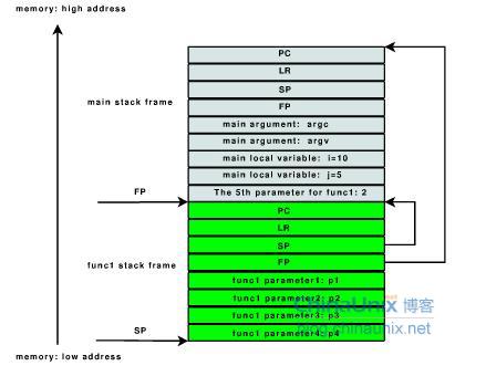上图描述的是ARM的栈帧布局方式,main stack frame为调用函数的栈帧,func1 stack frame为当前函数(被调用者)的栈帧,栈底在高地址,栈向下增长。图中FP就是栈基址,它指向函数的栈帧起始地址;SP则是函数的栈指针,它指向栈顶的位置。ARM压栈的顺序很是规矩,依次为当前函数指针PC、返回指针LR、栈指针SP、栈基址FP、传入参数个数及指针、本地变量和临时变量。如果函数准备调用另一个函数,跳转之前临时变量区先要保存另一个函数的参数。
