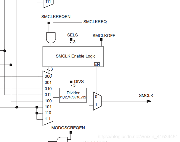我找到了这里 这个位是默认是0 说明输出的SMCLK是 直接从上一级输出来的没有经过分频! 我们继续找上一级是哪里来的这个没有被分频的时钟 接下来我们找到了这个寄存器