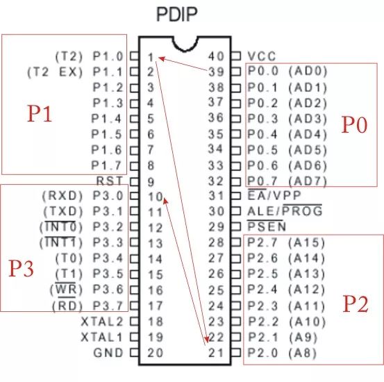学习51系列的CPU需要记忆脚位功能,我学习的时候得益于其简单的熟记方法,脚位的功能与位置掌握得很快,不用死记硬背,就可以轻松记住P0、P1、P2、P3的脚位,请看下图: