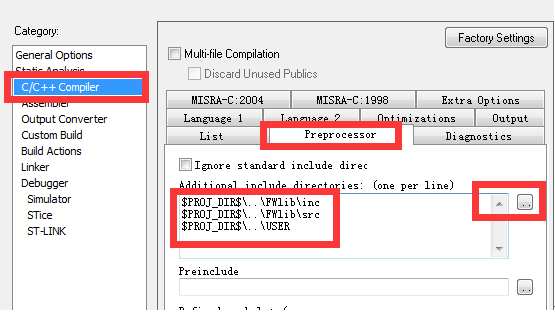 (2)添加编译路径:C/C++ Compiler -> Preprocessor,并将路径设置为相对路径,即文件夹移动到什么地方都可以编译;