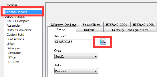(1)GeneralOptions -> Device,设置对应STM8单片机型号;