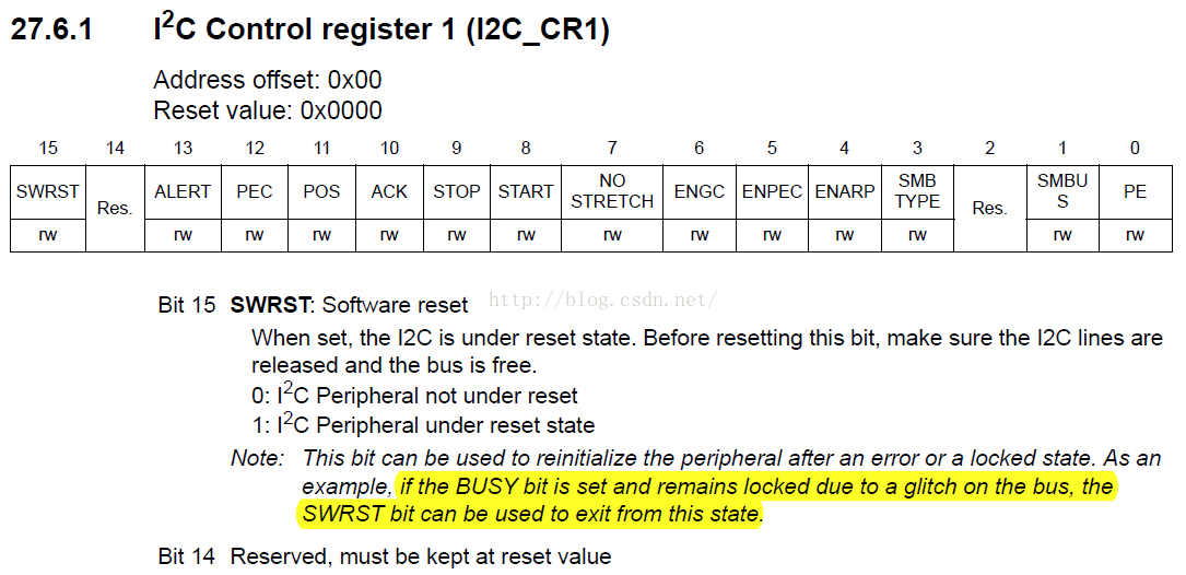 意思是说SWRST位可以在出错或死锁时,用于复位I2C控制器,例如众所周知的BUSY位问题。我没有看其它老STM型号的手册,至少STM32F4xx有SWRST位,STM32L0xx用户指南提到可以用PE位复位。