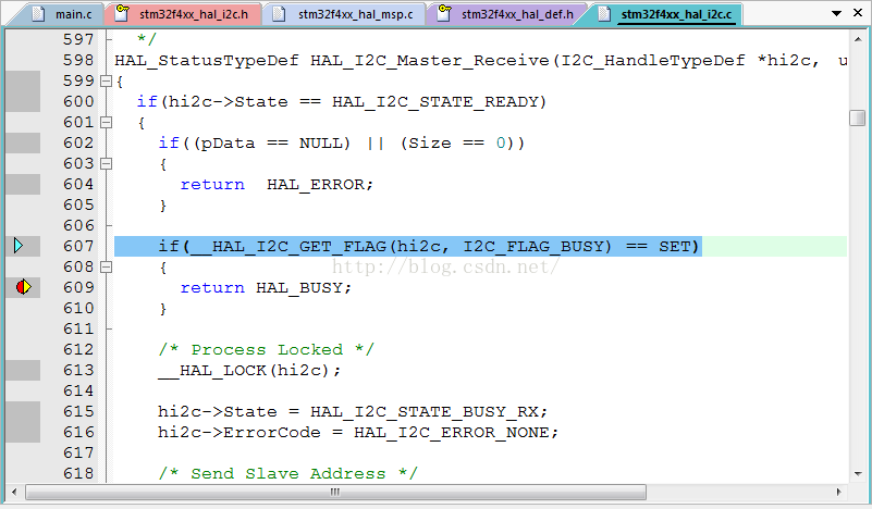 单步运行,可以看到进入stm32f4xx_hal_i2c.c程序中I2C读写函数不远处(如图阴影所在行),读BUSY位,总会得到SET的结果,无法继续执行后续程序而返回。