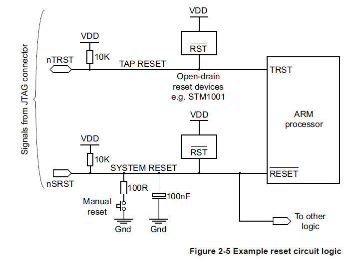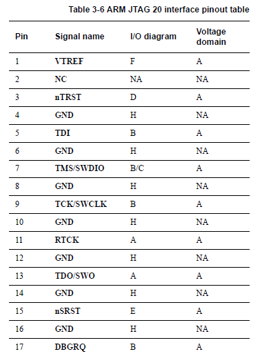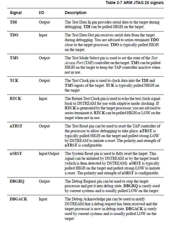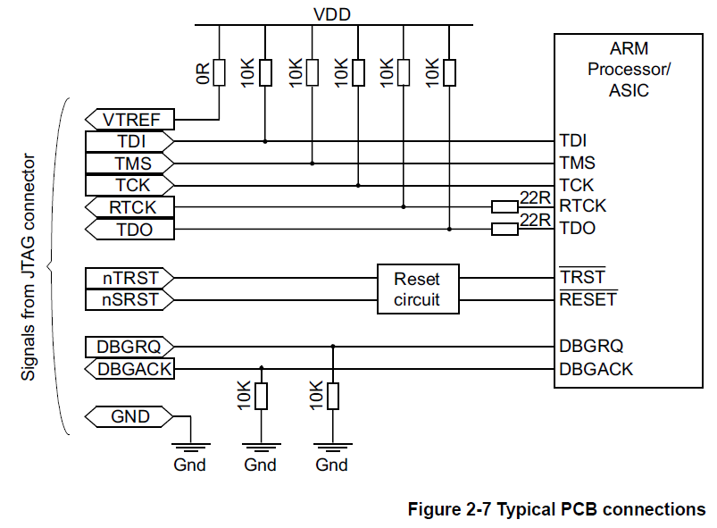 • The signals TDI, TMS, TCK, RTCK and TDO are typically pulled up on the target board to keep them stable when the debug equipment is not connected.