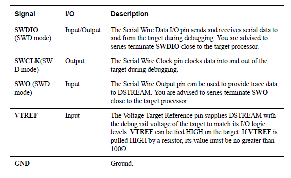 • To improve signal integrity, it is good practice to provide an impedance matching resistor on the SWDIO and SWO outputs of the processor.