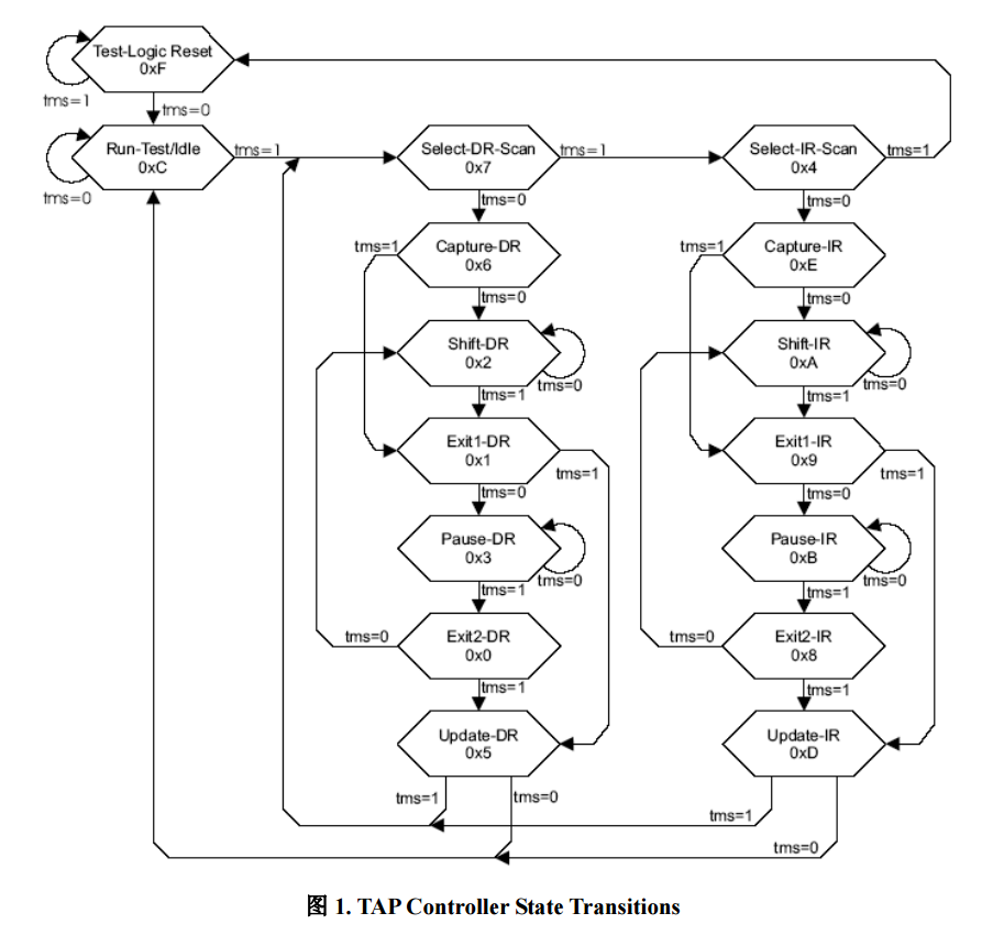 TAP 的状态机如图 1 所示,总共有 16 个 状态。在图中,每个六边形表示一个状态,六边形中标有该状态的名称和标识代码。