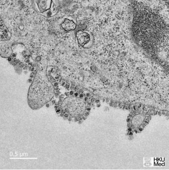 香港大学研究人员于1月31日公布首批新型冠状病毒在细胞内复制过程的图像。通过新型冠状病毒的薄片电子显微图像显示,病毒粒子从受感染细胞的表面释放出来,每个受感染的细胞会衍生出数以千计的病毒粒子,从而继续感染新细胞。