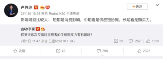 小米集团副总裁兼中国区总裁卢伟冰在微博上回答网友关于 ”你觉得这次疫情对消费者的手机购买力有影响吗“ 的提问称,影响可能是比较大的,其中短期是消费影响,中期看是供应链协同,而长期看是购买力。