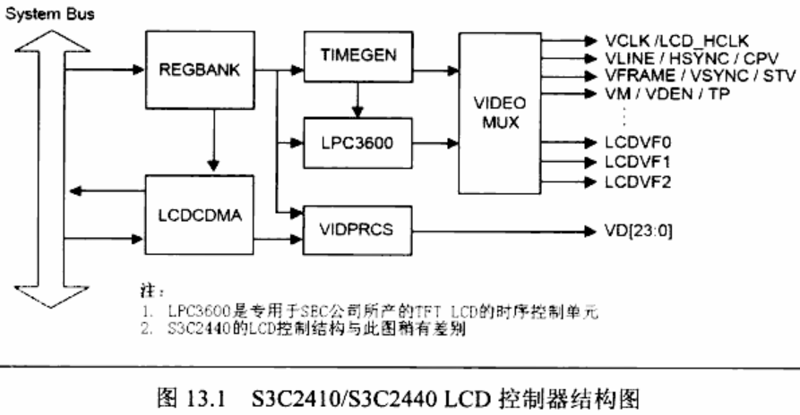 1:S3C2410,2440LCD控制器提供了驱动STNLCD TFTLCD所需要的所有信号, REGBANK是LCD控制器的寄存器组,含有17个寄存器及一块256X16的调色板内存,用来设置二线参数。
