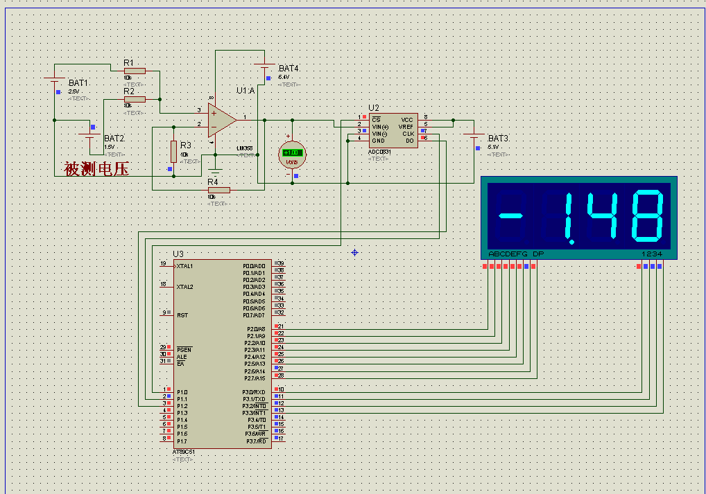 用358做一个加法器,通过ADC0831 AD转换,51单片机控制,可以测量正2.5V至负的2.5V电压值。可以扩展到大电压的测量 加分压电阻即可