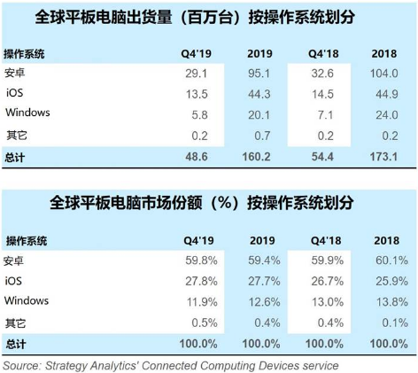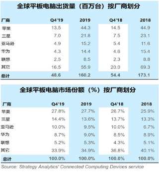 Strategy Analytics 高级研究分析师 Chirag Upadhyay 补充说:“可拆卸平板电脑的商业更新正处于令人失望的时期,这是由于 Windows 移动计算需求现更青睐于高端轻薄型笔记本电脑。更麻烦的是,大多数 Windows 可拆装二合一电脑厂商都专门针对企业用户提供更高利润的高端产品,但是拥挤的市场并不能让所有厂商都增长,尤其是面临苹果在此价格段凭借其 iPad Pro 以及 iPad Air(带键盘)积极角逐市场所带来的竞争压力。尽管苹果具备新的竞争力,由于圣诞季 iPad Pro 的需求急剧下降,2019 年 Q4 苹果平板电脑出货量仍下降了 7%。”