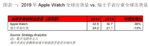 Strategy Analytics 最新发布的研究报告指出,Apple Watch 在 2019 年的销量超过了整个瑞士手表行业。2019 年 Apple Watch 全球出货量为 3070 万,而所有瑞士手表品牌的总出货量为 2110 万。 诸如 Swatch 这样的瑞士公司正在输掉智能手表大战。