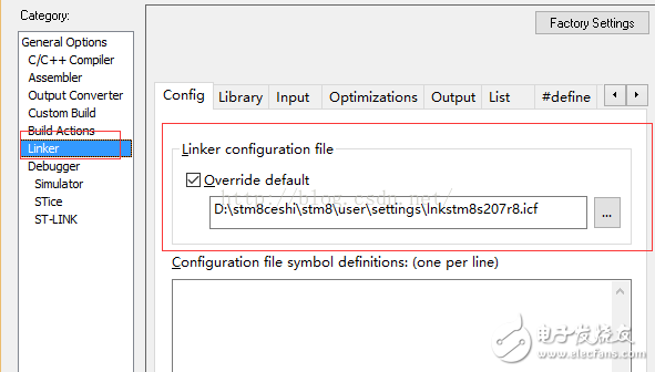 在这里面可以看到好多.icf后缀的文件,然后选择一个和芯片一致的,我就选择lnkstm8s207r8.icf,复制到我们的工程里面,再在IAR里面如下设置
