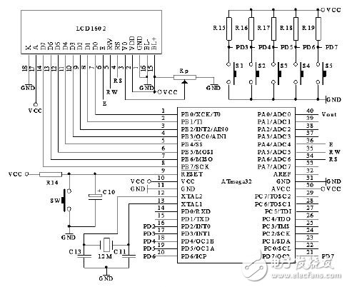 测试仪以单片机ATmega32为核心,扩展可编程的漏电电流源、漏电电流的检测电路、触头状态的监测电路、键盘和显示等外围设备。ATmega32是基于增强型AVR RISC结构的8位微控制器,指令集先进,指令执行时间采用单时钟周期,速度是普通8051单片机的8~12倍。工作频率达16MHz,片内32K字节Flash程序存储器、1个硬件16位定时器和2个8位定时器、4路PWM输出、8路A/D转换、1个全双工异步串行口、32个通用I/O口。具有低功耗、高速、超强抗干扰等优点,在同类产品中具有较高的性价比。