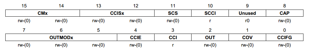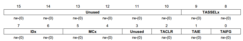 1 #include 2 void main (void) 3 { 4 WDTCTL = WDTPW + WDTHOLD; 5 6 7 TA1CTL|=TASSEL_2+TACLR+MC_3+ID_3;//采取内部时钟源1.04M,八分频,增减计数模式 8 TA1CCTL0=CCIE;//启用定时器中断 9 TA1CCR0=65535;//计数1S 10 P1DIR|=BIT0; 11 _EINT(); 12 //LPM4; 13 while(1); 14 } 15 #pragma vector=TIMER1_A0_VECTOR 16 __interrupt void ta10_isr(void) 17 { 18 P1OUT^=BIT0; 19 } View Code 测试通过,这个程序可以是LED1按2秒的频率闪烁(1秒亮,一秒暗)下面分析下: 第1句:WDTCTL = WDTPW + WDTHOLD; 这一句有点不太懂了,明明是定时器,怎么把看门狗定时器给停止了呢? 第2句:TA1CTL |= TASSEL_2+TACLR+MC_3+ID_3; 后面的解释:采取内部时钟源1.04M,八分频,增减计数模式。 先分析程序句,去头文件里找各自的定义: 1 SFR_16BIT(TA1CTL); /* Timer1_A3 Control */ 1 #define MC_0 (0*0x10u) /* Timer A mode control: 0 - Stop */ 2 #define MC_1 (1*0x10u) /* Timer A mode control: 1 - Up to CCR0 */ 3 #define MC_2 (2*0x10u) /* Timer A mode control: 2 - Continous up */ 4 #define MC_3 (3*0x10u) /* Timer A mode control: 3 - Up/Down */ 5 #define ID_0 (0*0x40u) /* Timer A input divider: 0 - /1 */ 6 #define ID_1 (1*0x40u) /* Timer A input divider: 1 - /2 */ 7 #define ID_2 (2*0x40u) /* Timer A input divider: 2 - /4 */ 8 #define ID_3 (3*0x40u) /* Timer A input divider: 3 - /8 */ 9 #define TASSEL_0 (0*0x100u) /* Timer A clock source select: 0 - TACLK */ 10 #define TASSEL_1 (1*0x100u) /* Timer A clock source select: 1 - ACLK */ 11 #define TASSEL_2 (2*0x100u) /* Timer A clock source select: 2 - SMCLK */ 12 #define TASSEL_3 (3*0x100u) /* Timer A clock source select: 3 - INCLK */ 第1句话表示了在特殊功能寄存器里找16个位置给Timer1_A3 Control;后面12句话定义了各个宏,实际上就是用前面的标示符表示后面的数,没别的意思。 从数据手册上截取: 数据手册对TACTL的结构有说明: 后面对各个有详细的说明,这里只说明遇到的: (1)TASSELx: (Timer_A Source select,A计时器的激励源选择) TASSEL_0: 00 代表着 TACLK,外部时钟单元 TASSEL_1: 01 代表着 ACLK ,Auxiliary clock ,辅助时钟单元,可做2、4或者8分频。 TASSEL_2: 10 代表着 SMCLK,Sub-main clock,子时钟单元,也可做2、4或者8分频。 TASSEL_3: 11 代表着 INCLK ,外部时钟单元 (2)IDx: 表示分频的个数 ID_0 ID_1 ID_2 ID_3 1分频,也就是不分 2分频 4分频 8分频 (3)MCx表示模式 百度文库找个图: 嘿嘿,这个图就是整个的定时器结构图和计数模式了,虽然有点复杂,但对于老爷们来说,这点事不算啥。 (4)TACLR:Timer A clear 第3句:TA1CCTL0=CCIE; 后面给出的解释是:启用定时器中断。 从头文件里获取 SFR_16BIT(TA1CCTL0); #define CCIE (0x0010) /* Capture/compare interrupt enable */ 如果TA1CCTL0=CCIE,实际上在置CCIE位为1的同时,把其他位置0, 第4句:P1DIR|=BIT0; BIT0在头文件里这么定义的,并不是0的意思: 1 #define BIT0 (0x0001) 2 #define BIT1 (0x0002) 3 #define BIT2 (0x0004) 4 #define BIT3 (0x0008) 所以这句话的意思是把P1.0 的方向设为输出。 第5句:_EINT(); enable interuption 打开全局中断。 相反的,_DINT(); disable interruption关闭全局中断。 第6句:#pragma vector=TIMER1_A0_VECTOR __interrupt void ta10_isr(void) 用关键字来__interrupt来定义一个中断函数。注意前面的下划线是两个,一个会出错的。 用#pragma vector来提供中断函数的入口地址。