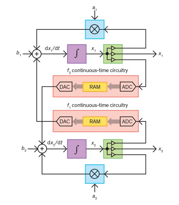 模拟计算芯片执行微分方程的速度比数字计算芯片快得多,功耗也低得多。虽然模拟计算机的缺点是必须根据你要解的方程的大小来线性地扩展系统,但是它们的并行性意味着它们的能力和性能也会得到扩展。