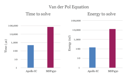 我们用有限的基准支持这些说法。图2比较了Sendyne的Apollo IC和25 MHz的Texas Instruments MSP430 MCU上求解Van der Pol方程的功耗和时间。