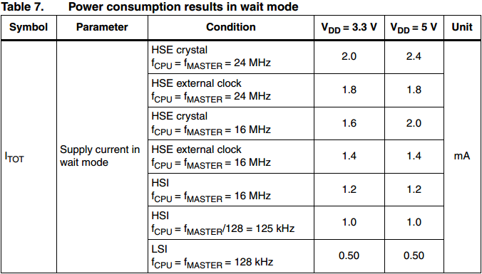 在等待模式下,所有寄存器与RAM的内容保持不变,之前所定义的时钟配置也保持不变(主时钟状态寄存器CLK_CMSR)。当一个内部或外部中断请求产生时,CPU从等待模式唤醒并恢复工作。