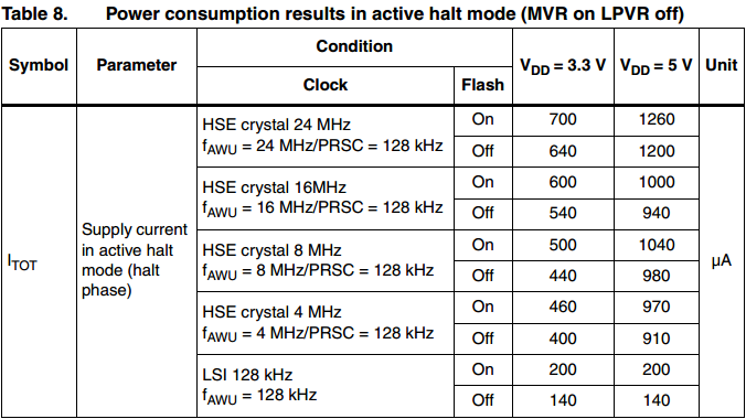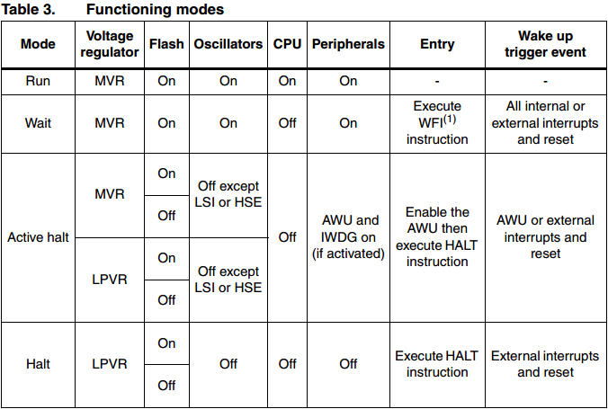 在活跃暂停模式下,主振荡器、CPU及几乎所有外设都被停止。如果AWU和IWD已被使能,则只有LSI RC与HSE仍处于运行状态,以驱动AWU和IWD计数器。为进入活跃停机模式,需首先使能AWU(如AWU章节所述),然后执行HALT指令。