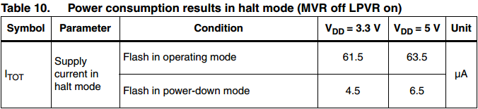 在这种模式下,为了节省功耗主电压调节器关闭。仅低电压调节器(及掉电复位)处于工作状态。