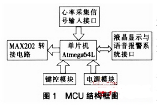 Atmega64L的外围电路主要包括:电源模块、键盘控制模块、液晶显示和语音报警系统接口、心率采集信号输入接口,见图1。