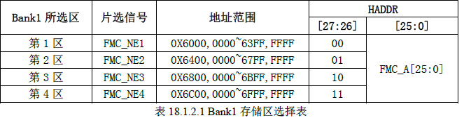 FSMC_A[25:0],而 HADDR[26:27]对 4 个区进行寻址。