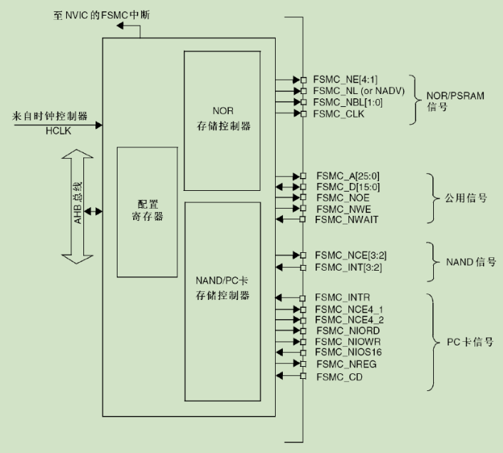 FSMC,即灵活的静态存储控制器,能够与同步或异步存储器和 16 位 PC 存储器卡连接,