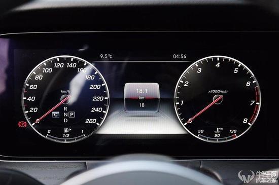 同样,奔驰的仪表盘也可以显示全景地图,并且支持双屏互通。不过两块屏幕显示内容完全相同,有些重复,并且转速表完全被省略,速度表也只剩下数显。