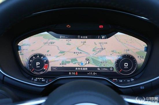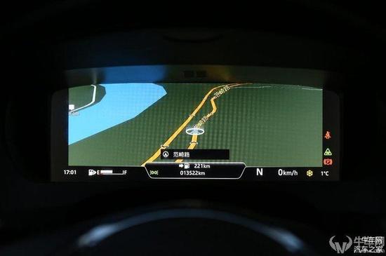 如果只是照抄机械仪表盘这么简单,奥迪盘绝不会得到众多的好评度,其最炫酷之处当属全景地图模式。在地图模式下,地图会被完完整整地填充在液晶屏内,看上去非常过瘾。而两侧的转速表和速度表则为全景地图让路,显示尺寸有所减小,但数显依旧存在,并没有牺牲过多行车信息读取的功能。