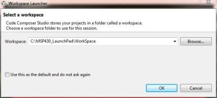 1)打开CCS,会弹出一个对话框请用户选择workspace的路径,可以选择任意一个文件夹,但请注意路径必须为全英文,不能有中文字符。下方的“Use this as the default and do not ask again”不建议勾选,如果勾选CCS之后将把此路径作为默认workspace路径不再更改。选择好workspace之后单击OK进入CCS。