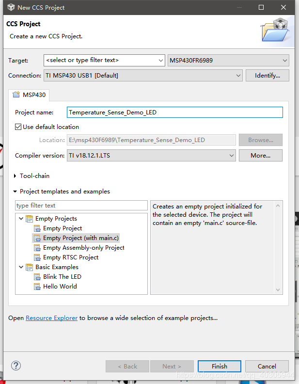 出现如下对话框。Project name中填写项目名称Temperature_Sense_Demo_LED,Device菜单中选择芯片型号MSP430FR6989,项目模板选择Empty Project (with main.c),然后点击Finish。