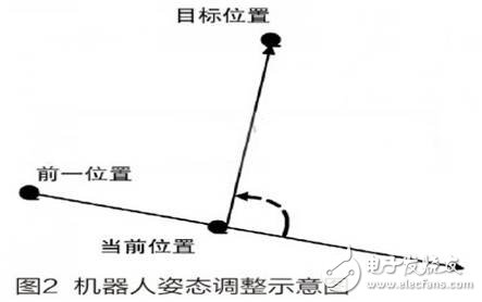 机器人移动过程中利用电子罗盘进行姿态调整,即调整前进方向,努力寻找一条最快捷的路径到达目标位置。机器人姿态调整主要取决于当前位置和前一位置与目标位置的距离,包括横向距离和纵向距离。若当前位置与目标位置的横向距离和纵向距离分别小于或者等于前一位置与目标位置的横向距离和纵向距离,表明机器人与目标位置的距离在逐渐缩小,机器人在朝目标位置前进,否则就说明机器人没有按预期的轨迹前进,需要再次进行姿态调整。姿态调整示意图如图2所示。
