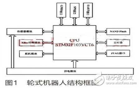 主板是针对该轮式机器人设计,采用ARM Cortex-M3内核的STM32F103VCT6处理器,主板资源包括SDRAM、NAND Flash,UART接口、GPIO接口、SPI接口和JTAG接口。辅助的资源有USB接口、定时器等。