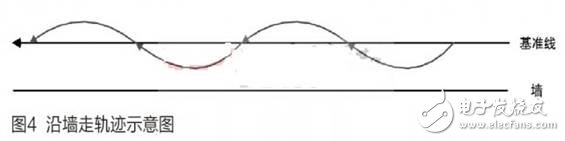 当机器人到达振荡位置时,需要调整路径规划策略,此时放弃全局路径规划策略,选择直接以公用墙为基准墙搜索房门。沿墙走算法的基本规则是:当机器人不断靠近墙面时需要调整两轮速差使机器人朝偏离墙面的方向前进;当机器人不断远离墙面时,则需要调整两轮速差,使机器人朝靠近墙面的方向前进。综合调整的结果是机器人的前进轨迹是以基准线为轴的类正弦曲线,沿墙走轨迹如图4所示。