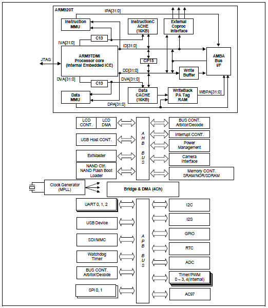"The S3C2440A holds 13 bus masters. They include DRAMrefresh controller, LCD_DMA, CAMIF DMA, DMA0,DMA1, DMA2, DMA3, USB_HOST_DMA,EXT_BUS_MASTER, Test interface controller (TIC) and ARM920T."
