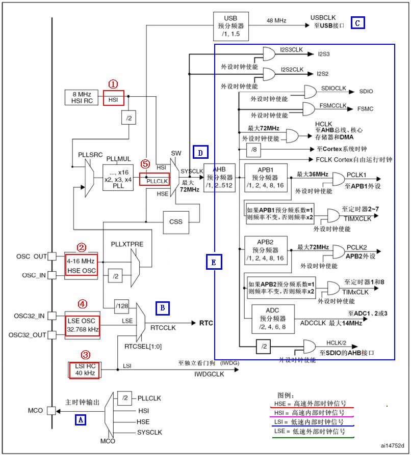 低速外部时钟(LSE):以外部晶振作时钟源,主要提供给实时时钟模块,所以一般采用32.768KHz。