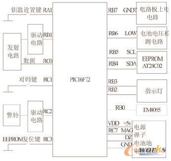 控制电路由上电保持电路,电压检测电路,无线发射电路和Microchip公司的单片机PIC16F72等组成(见图4)。