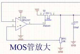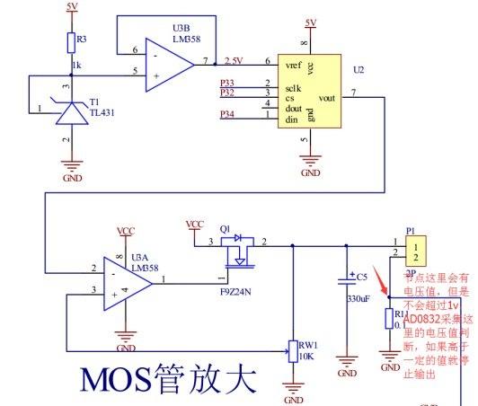 将上述TLC5615输出的可调电压送到运放LM358的反相端,通过MOS管(F9Z24N)放大。同时在F9Z24N的输出端用RW1(10K)电位器分压,取一定比例的输出电压反馈到比较器正相端,构成一个反馈系统。此时MOS管输出的PWM波的占空比将根据负载和输入电压而变化以保证输出电压的稳定。C5作为输出滤波电容,滤掉输出电压纹波。
