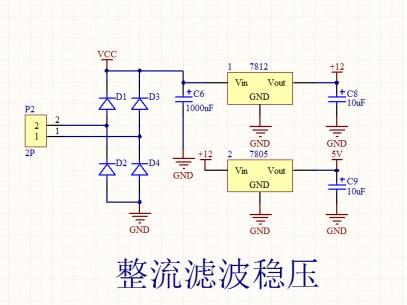 P2为接线柱,是整个系统的输入电压端口,整个数控电源有此输入能量。D1、D2、D3、D4为四个二极管(in4007),起整流的作用,C6为滤波电容。整流滤波电路是使供电可以为交流,同时也可以用直流供电(交流供电不要超过20V,直流不要超过35V)。受电压限制的主要是后级运放耐压、TL431耐压以及7812的耐压值。7812主要为保护7805,7805稳出5V电压共单片机供电使用。但是7805耐压值是15V,所以前级要加7812保护7805。