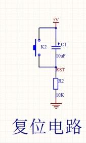 RST连接单片机复位管脚,此电路及有上电复位功能,又有手动复位功能。C1、R2构成上电复位电路,上电瞬间C1导通,则RST为高电平,单片机将复位,电压稳定后C1储存的电能通过R2对地释放掉,单片机将正常运行。同样K2按下时RST为高电平,单片机复位,弹起来时RST为低电平,单片机正常运行.