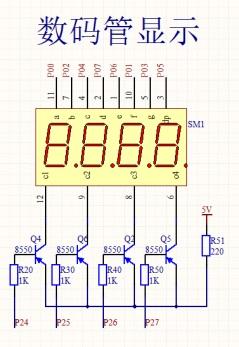 数码管显示采用四位一体共阳数码管,这样使电路更为简单,只需四个9012三极管就可以将其驱动。P24、P25、P26、P27分别作为数码管的位选端,控制是否选通哪一位数码管。采用PNP型三极管,低电平导通,高电平截止。R20、R30、R40、R50为三极管基极限流电阻,此电阻及能保护三极管又能保证三极管导通时处于完全导通状态。R51为限流电阻,此电阻的大小直接决定数码管的亮暗成都,在此选择220欧姆、1/4色环电阻。数码管的阴极端直接接单片机的P0口,而不需上拉电阻。STC89C51的单片机P0口为漏极开路,所以作为输出时必须接上拉电路,而作为输入时相当于数码管作为上拉,所以不再需要上拉电阻,及简化了电路又节省了成本。